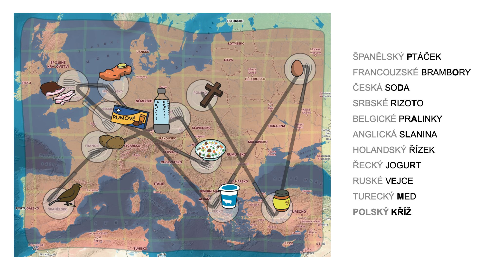 Zobrazit řešeníVe třech košících leží jídla (a kříž), která mají společné to, že k nim lze přiřadit nějaký stát. V prvním košíku najdeme SRBSKÉ RIZOTO, FRANCOUZSKÉ BRAMBORY, HOLANDSKÝ ŘÍZEK a RUSKÉ VEJCE, ve druhém košíku ŘECKÝ JOGURT, BELGICKÉ PRALINKY a TURECKÝ MED a ve třetím ŠPANĚLSKÉHO PTÁČKA, ČESKOU SODU, ANGLICKOU SLANINU a POLSKÝ KŘÍŽ.