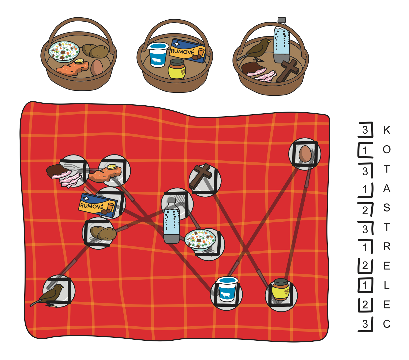 Co jsme ještě nepoužili? Nenápadný vzor na dece a ve kterém ze tří košíků se jídla nacházejí. Jednotlivé části vzoru pod talíři připomínají chlívečky v polském kříži. Písmeno z chlívku určíme podle toho, jestli jídlo pochází z prvního, druhého, nebo třetího košíku. Ve stejném pořadí, jako jsme četli mezitajenku, přečteme tajenku KOTA STRELEC, další šifru budeme tedy hledat na Střeleckém kopci.