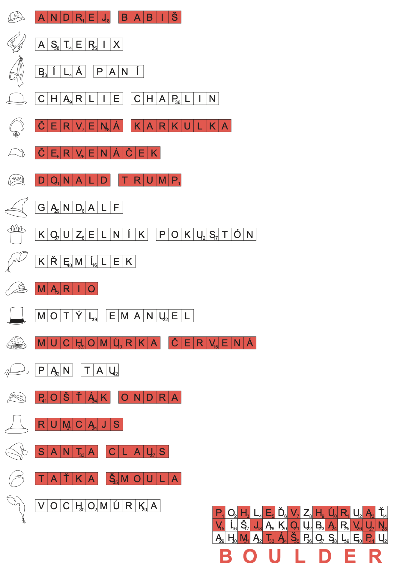 Zobrazit řešeníNejdříve pojmenujeme majitele jednotlivých klobouků, pomáhá nám s tím počet chlívků a abecední řazení řádků. Potom pomocí indexů vyplníme tabulku v pravém dolním rohu šifry. Přečteme si mezitajenku POHLEĎ VZHŮRU AŤ VÍŠ JAKOU BARVU NAHMATÁŠ POSLEPU. Pokud jste zůstali luštit poblíž stanoviště a pohledíte vzhůru, uvidíte logo Red Hatu, ve kterém je… počkejte si… červený klobouk.