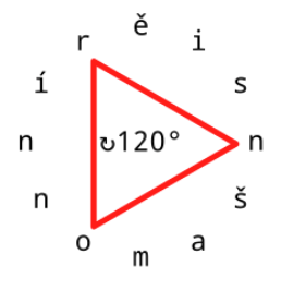 Vrcholy ukazují na písmena “NOR”, ale v kruhu je naznačeno otočení o 120°. Když ho provedeme, dostaneme sice stejný obrázek, ale “čtecí” vrchol nyní ukazuje na písmeno “O”, takže od něj po směru čteme “ORN”, což chceme.
