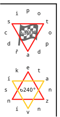 Projdeme celou cestu k cílovému praporku a po cestě čteme “VÝBORNĚ PRAPOR ZAKRÝVÁ NÁPIS ↻300° A PROTO VÁS CÍL NEZ”. Pokud si na místě cílového praporku představíme nápis “↻300°”, můžeme trojúhelníkem i na cílovém poli otočit a číst “AST”. Zpráva i tak vypadá useknutě a očividně říká, že nás cíl nezastaví. Pokračujeme tedy v pohybu dál dle dosavadních pravidel, s tím rozdílem, že navštěvujeme pole, kde už jsme předtím byli.