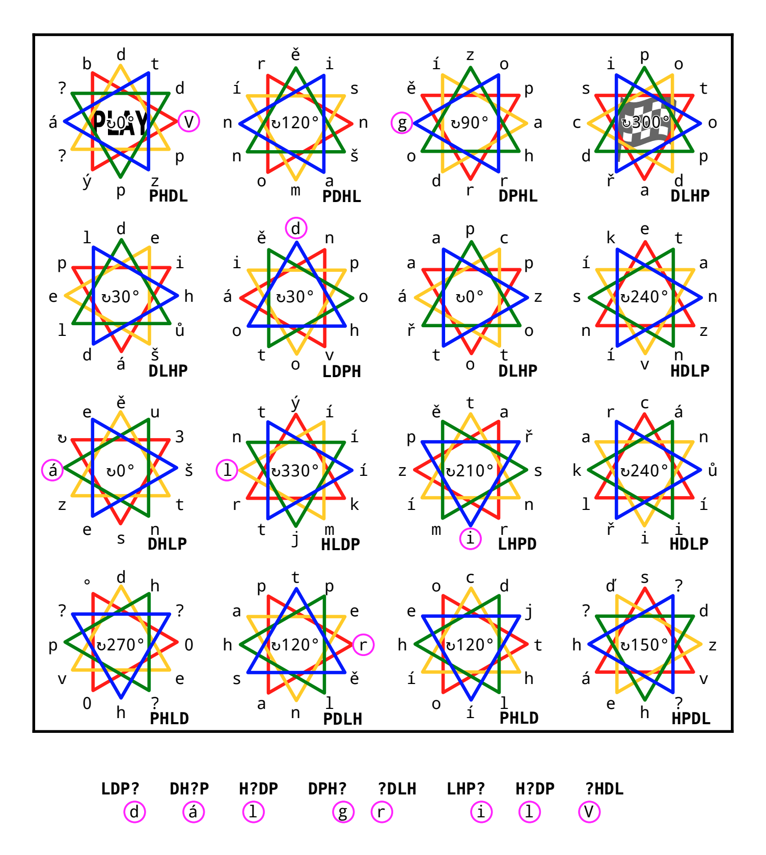 Zobrazit řešeníZadání vypadá jako bludiště 4x4, kterým se chceme dostat z pole PLAY k cílovému praporku. Po cestě budeme asi vybírat písmena z kruhů a něčím otáčet o naznačené úhly. V zadání je navíc jediné velké písmeno “V” v kruhu kolem PLAY, tedy pravděpodobně první písmeno zprávy.