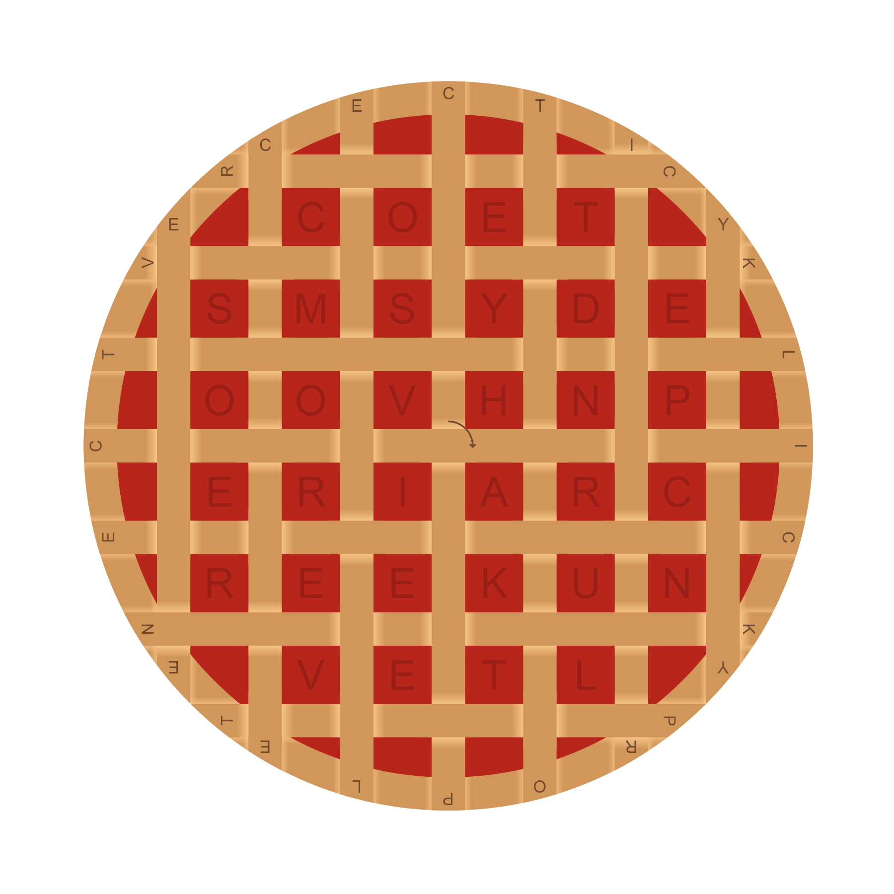 Vystřihneme proužky a propleteme je tak, aby světlá místa byla zakrytá. Mřížku slepíme a ve směru šipky přečteme mezitajenku na obvodu CTI CYKLICKY PROPLETENE CTVERCE.