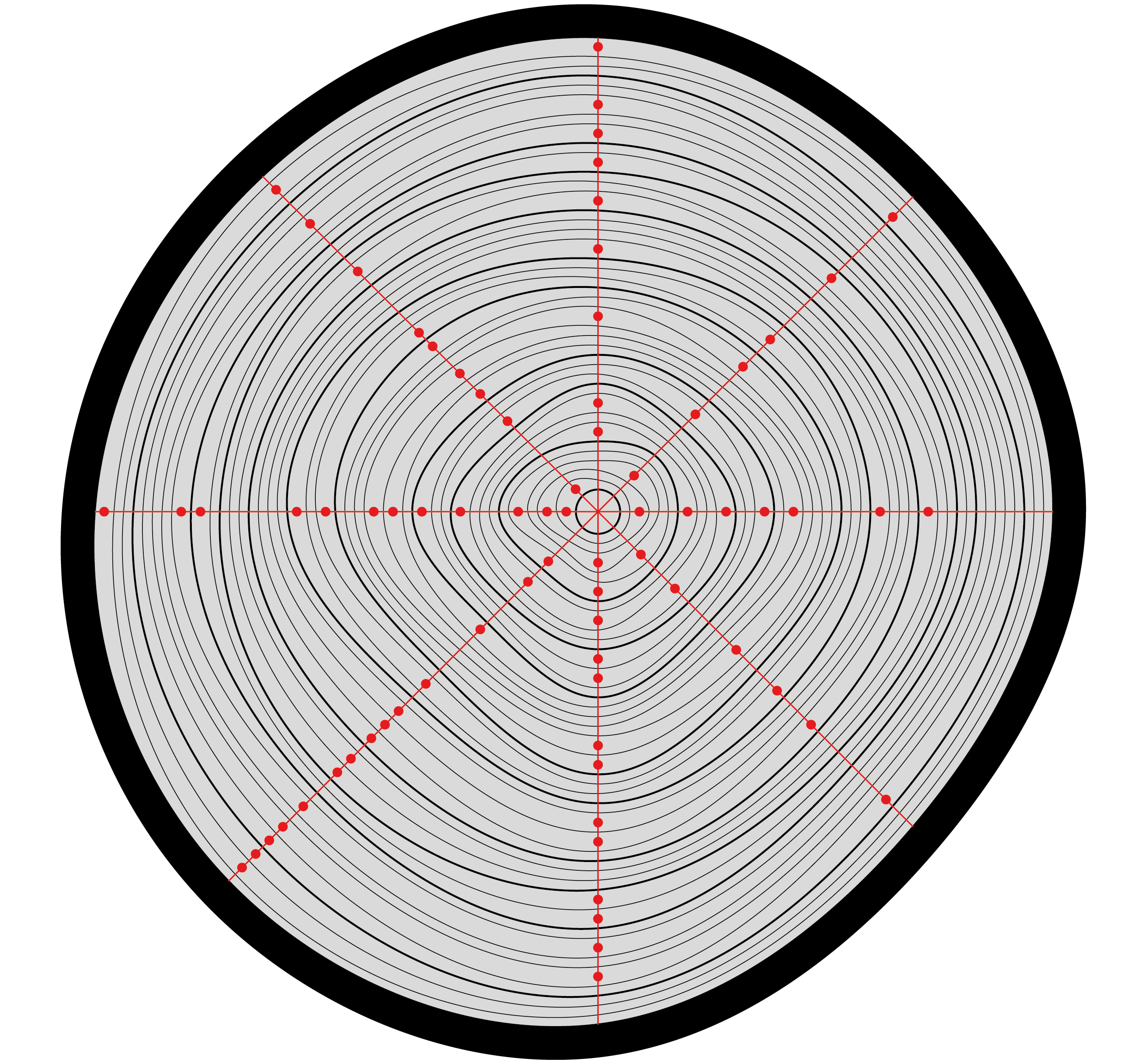Vidíme příčný řez kmenem s tenkými a tlustými letokruhy, tlusté vypadají trochu jako nějaké oddělovače. Všimneme si, že na přímkách se semaforovými směry jsou rozestupy letokruhů vždy 1 nebo 2 jednotky délky. Navíc mezi dvěma letokruhy je vždy 6 krátkých a 2 dlouhé rozestupy, což odpovídá semaforu. Zevnitř (tj. od nejstaršího letokruhu) přečteme ORESA|JAVR|CER|IROVEC|OLS|JAAN|JIL|DB|PATAN|LIP, což jsou názvy stromů, kterým chybí jedno písmeno. Z doplněných písmen přečteme KOD JE SMULA.