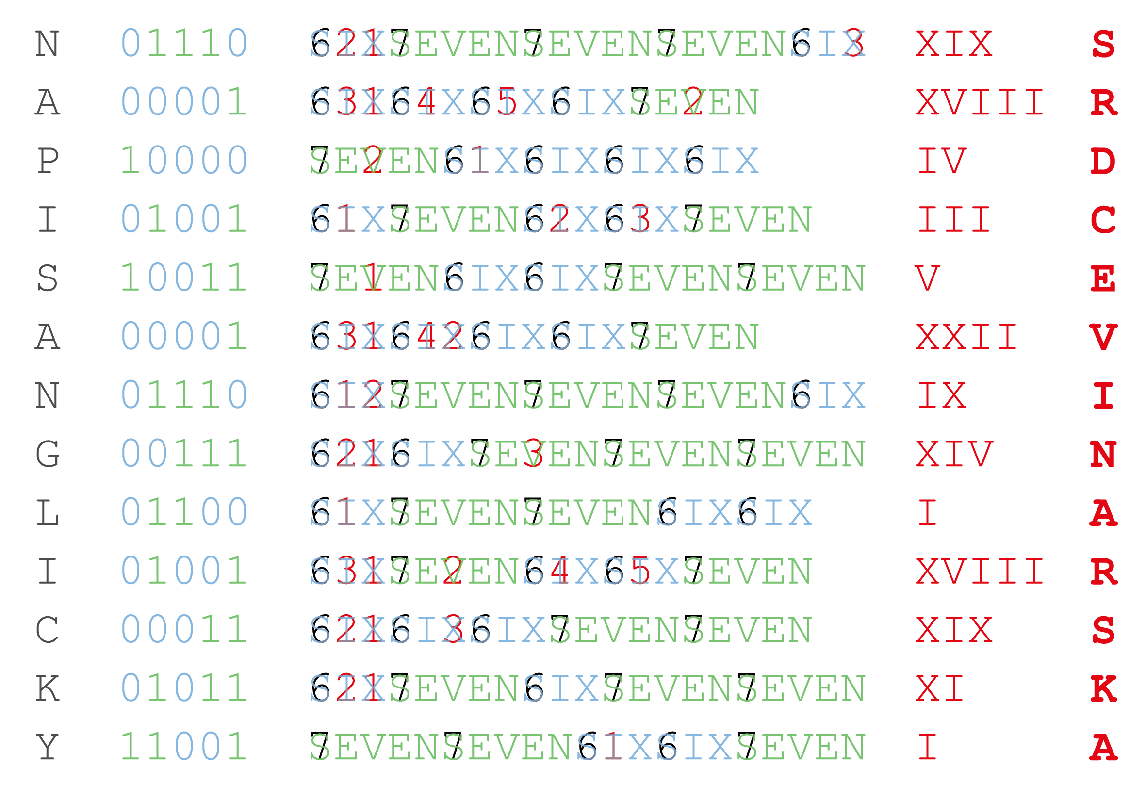 Začneme tím, že využijeme, že šestek a sedmiček je dohromady 5 a přečteme binárku (šestky odpovídají nulám a sedmičky jedničkám). Získáme mezitajenku: NAPIS ANGLICKY. V šifře mají speciální význam číslice 6 a 7. Za každou šestku napíšeme slovo SIX a za každou sedmičku slovo SEVEN. (Začneme psát vždy na pozici, kde je číslice 6 nebo 7.) Teď máme číslice 1 až 5 vždy na pozici, kde je písmeno I, V nebo X. Takto vybraná písmena na každém řádku uspořádáme podle odpovídajících čísel a čteme římana: SRDCE VINARSKA.