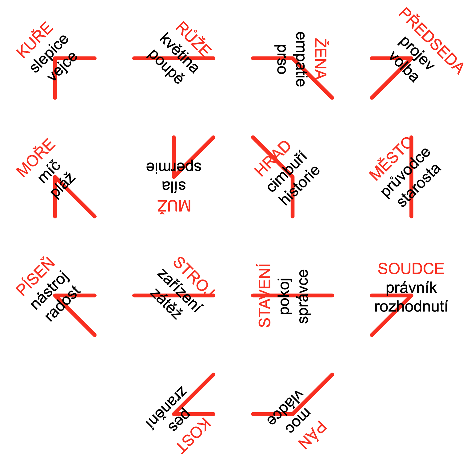 Vidíme 14 dvojic slov. Každá dvojice asociuje jeden vzor podstatných jmen. Zároveň určíme vzory u každého slova. Vytvoříme semafor tak, že vždycky propojíme každou dvojici s dvojicemi, které reprezentují vzory slov v původní dvojici. (Jsou to vždy sousedé.) Abychom přečetli správné písmeno, musíme si semafor natočit tak, aby byl text ve středu semaforu orientovaný správně. Tajenku čteme v pořadí vzorů. (Rody jsou seřazené následovně: mužský, ženský, střední.) Vyjde: SKALA HELGOLAND.